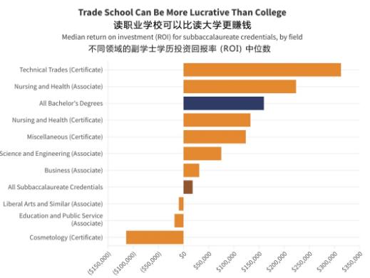 技术行业的副学士学位——包括车辆维修、精密金属加工、电气和电力传输安装等,都比学士学位更有利可图。其中,两年制技术行业课程的平均投资回报率为31.3万美元,两年制护理和其他卫生专业的平均回报率也高达22.4万美元,而学士学位的平均投资回报率仅为16万美元。