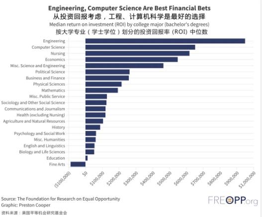 根据美国教育部的大学积分卡公开数据,我们发现,确实有部分专业更可能获得经济上的回报。在FREOPP的研究中,学士学位的投资回报率中位数为16万美元。