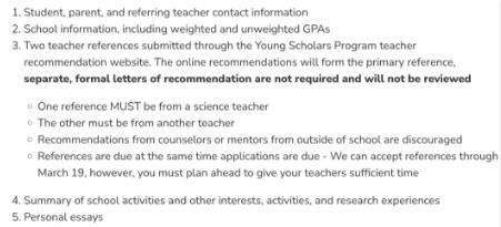 申请时需要提供推荐信,推荐人必须来自科学老师,另一份必须来自另一位老师,不鼓励校外辅导员或导师的推荐,还要有学校活动及其他兴趣、活动和研究经历的总结以及个人随笔。